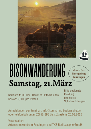 Mitten in Wittgenstein lebt eine Bisonherde und kann live erlebt werden. In der Führung erfährt man unter anderem etwas zur Historie des Tieres bis in die Prähistorie zurück, über die Herkunft aus Kanada sowie zu Haltungsformen in Deutschland. Informationen zu Artenschutz und landwirtschaftlicher Nutzung werden ebenso angesprochen.